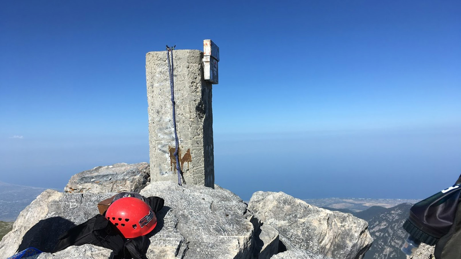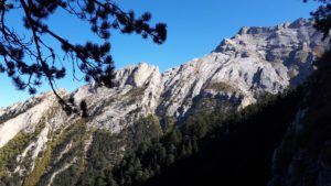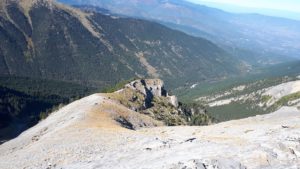 Kopsi Skolio is undoubtfully the most demanding way to reach Skolio. The ‘Skolio ridge’ is one of the ‘kopsis’ on what we use to call the ‘Dark side of Olympus’, the darker part of the high peaks (Christakis, Skolio, Skala, Mytikas, Stefani, Toumba, Profitis Illias). Kopsi Skolio starts in the Xerolaki Valley, it is a genuine vertical mile starting at 1300 metres elevation and climbing steep up to 2900 metres within 4 kilometres. The climb is steep and demanding. The first half of the climb is on a mostly difficult to distinguish trail in the forest, signposted with red blases, not always visible. In one part some iron bars facilitate the progress in a 5 meter high rock wall.