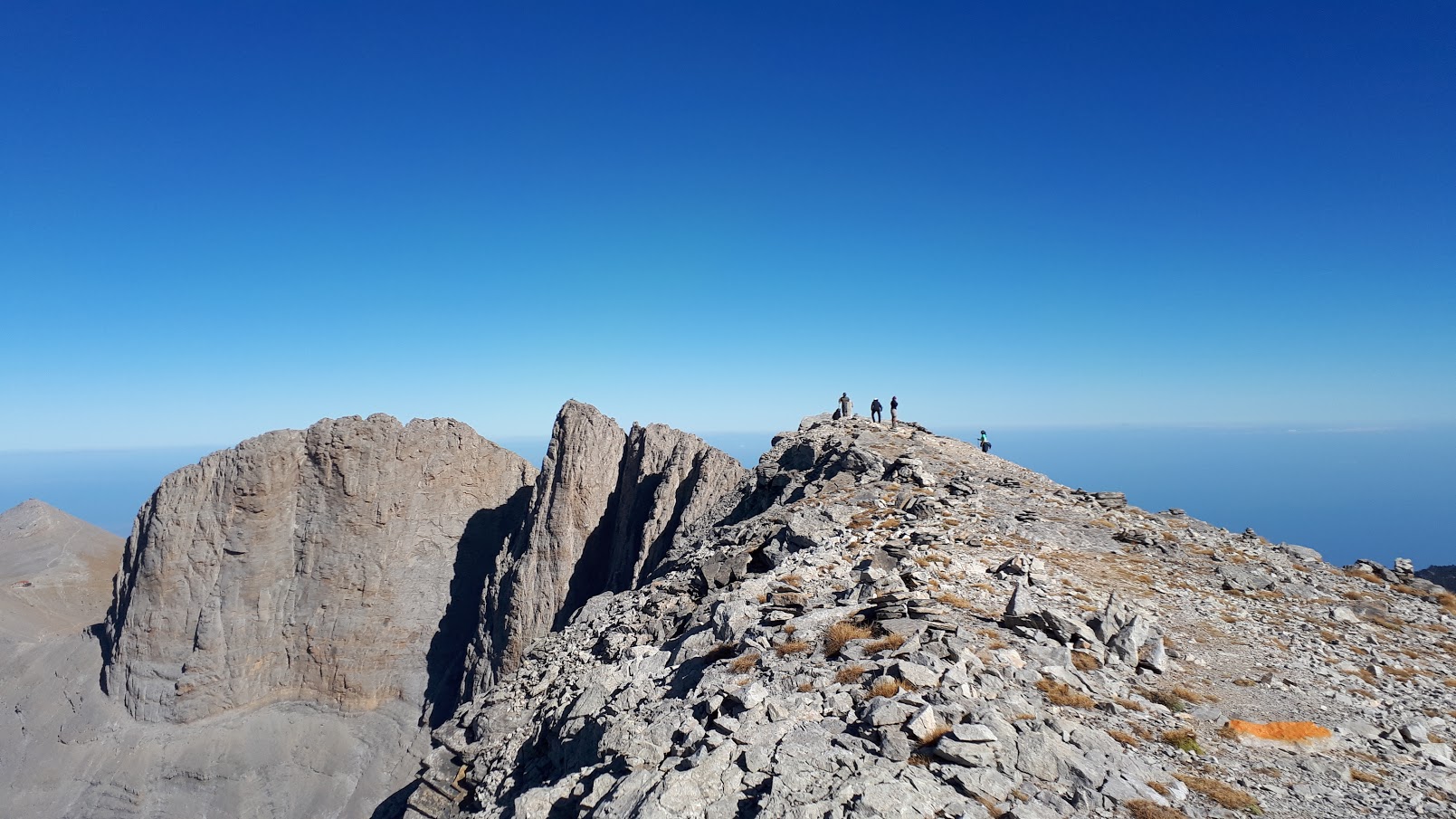The second part of the route is without signposting, but the route is obvious: just take the steepest way up. This part crosses at 2300-2600 metres elevation a scree slope that makes progress far from easy, and poles are highly recommanded for progress. The scree section finishes at around 2750 m on the trail between Christakis (peak) and Skolio. From this point Skolio can be reached in 15 minutes. The route from Skolio to Skala follows easy trails. A fast way from Skala to the huts on the Plateau of the Muses is Kakoskalos, the track from Skala to Mytikas, followed by the descend of ‘Louki’ to the trail that crosses Zonaria to the huts on the Plateau of the Muses. This route is fast for mountain runners with good alpine skills. For hikers it’s easier to descend Skala direction Refuge A and to hike to the Plateau of the Muses by the Zonaria trail.